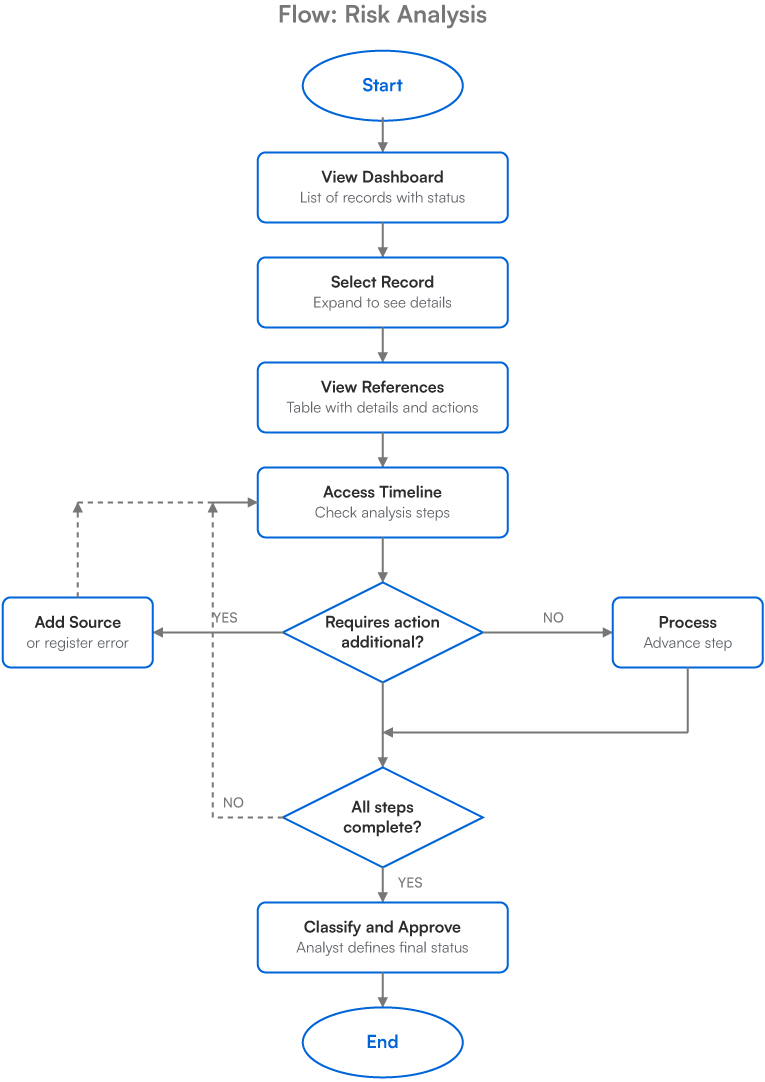 The system integrates multiple modules with different access profiles: managers need strategic vision, analysts need detailed tools, operators need quick access. I organized complexity into logical layers. Side navigation with modules grouped by function: registrations at the base, analyses at the core, management at the top. Fixed navigation ensures constant orientation. The structure covers complete states: loaded, empty, contextualized errors, and feedback for critical actions.
