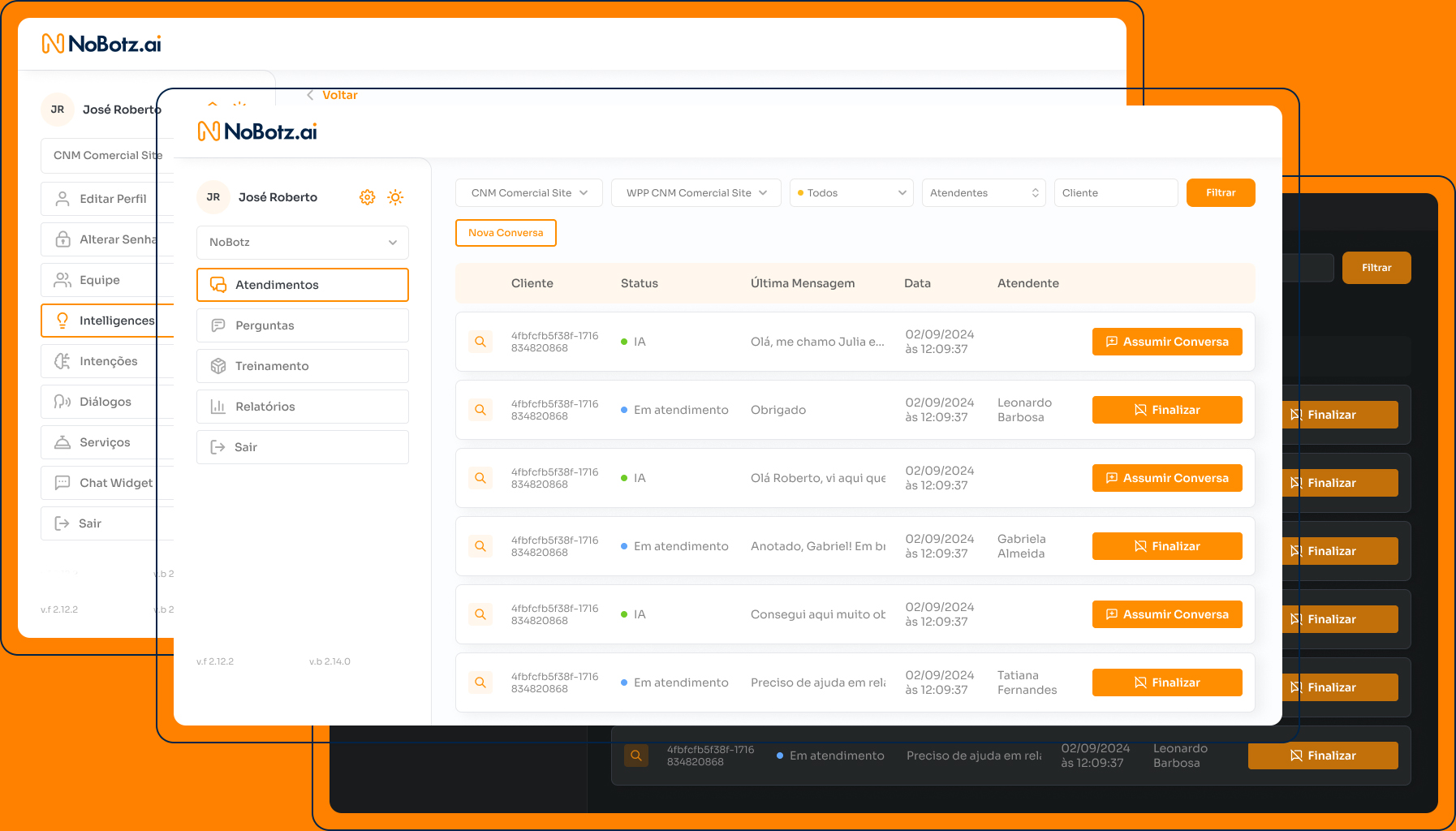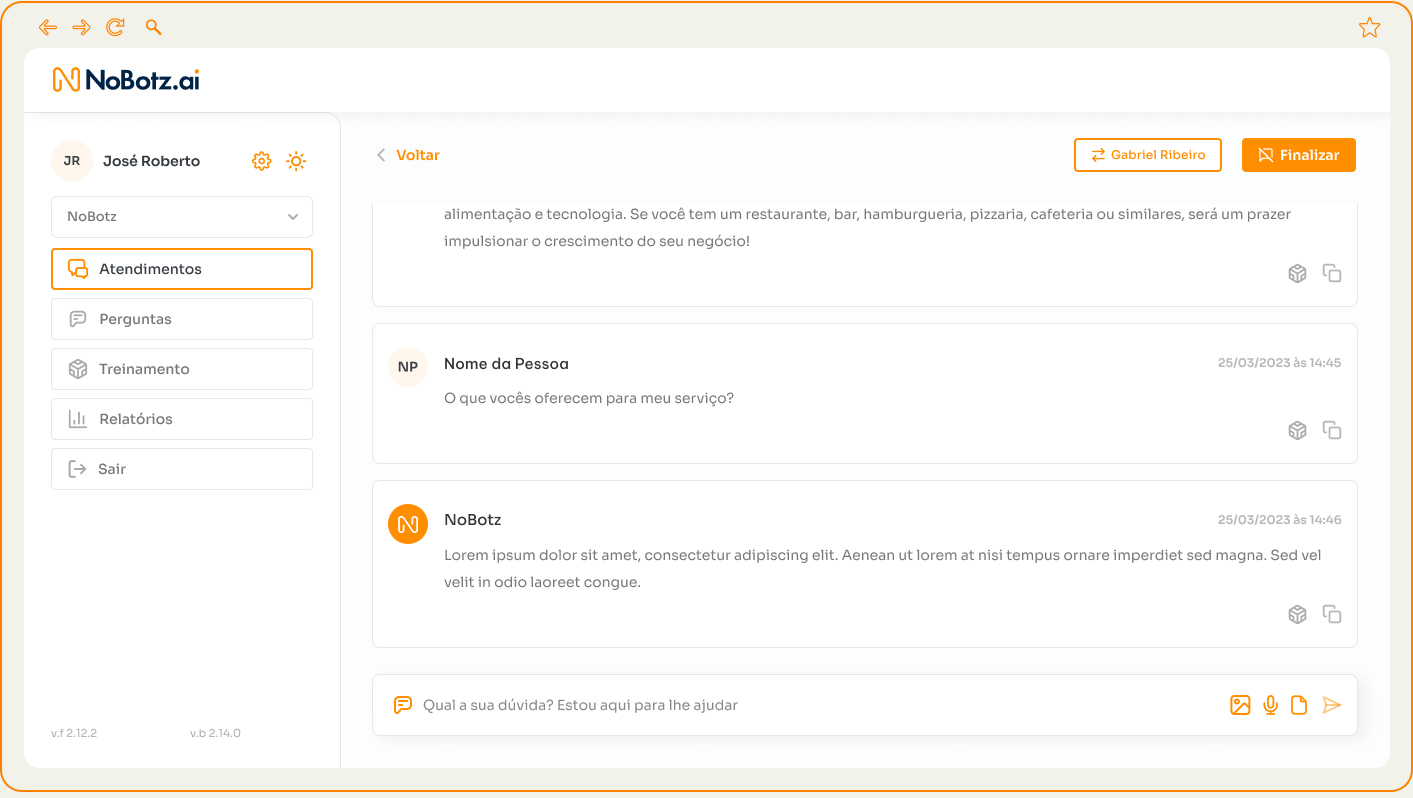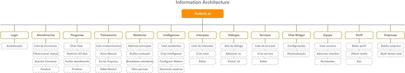 Estruturei a plataforma em torno de workflows reais de operação: Atendimentos como hub central com lista de conversas ativas e filtros, Perguntas com chat view e histórico completo, Treinamento pra gerenciar conhecimento da IA, Relatórios com métricas e evolução, Intelligences pra configurar assistentes, e gestão de Equipe com permissões.