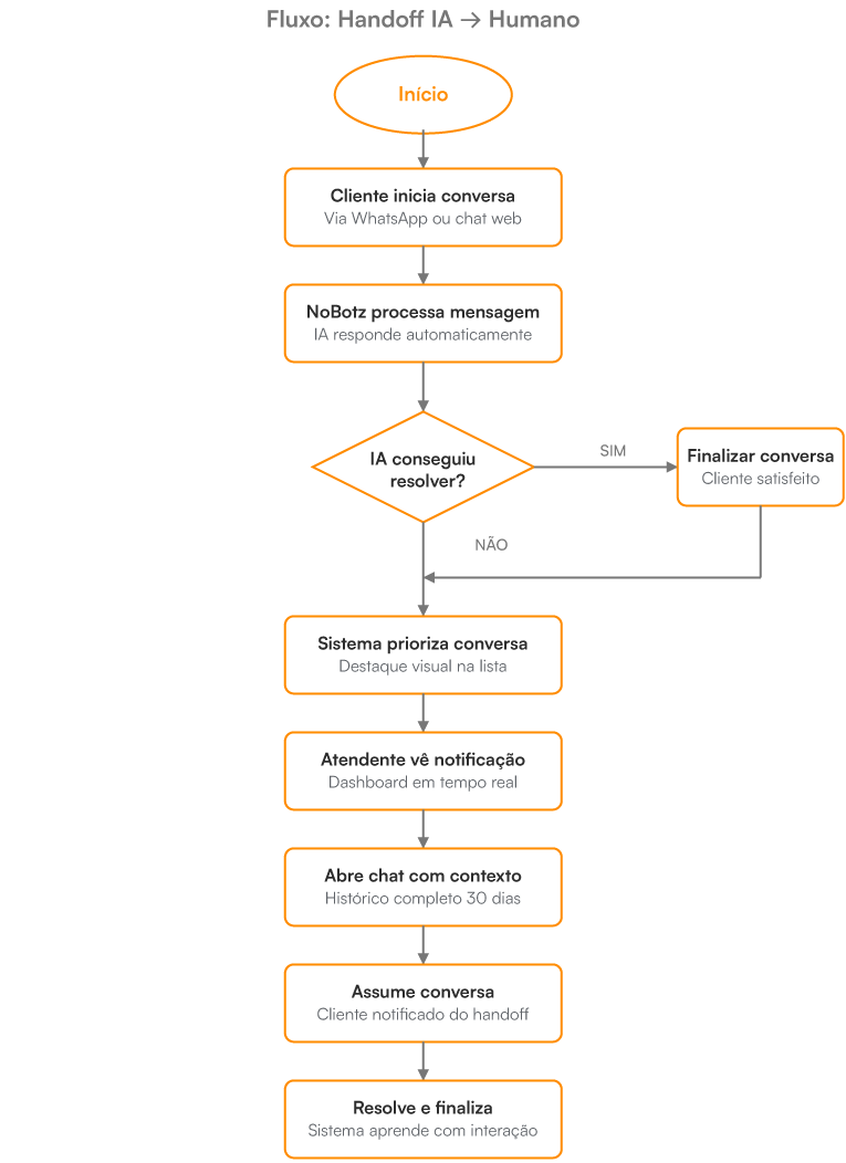 Chat distingue IA através de avatar laranja. Histórico lateral carrega 30 dias de interações, dando contexto necessário pro agente decidir se assume ou não.